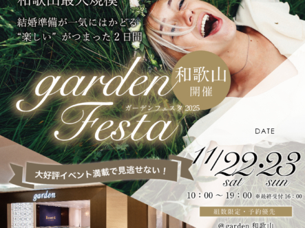 garden和歌山フェスタ開催決定!たくさんの婚約指輪・結婚指輪のブランドを見比べ&着け比べできるメインイベントにフェスタ限定のデザインが大集結!婚約指輪は¥59,800~、結婚指輪は10万円~お求めいただけます!さらに、ブライダル・ウエディングイベントが満載&現役の挙式プランナーによる式場紹介など、結婚準備がグッと進むこと間違いなし! ≪※予約必須≫