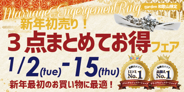 - 新年初売り!!garden和歌山で婚約指輪・結婚指輪のお得なセットフェアを開催!ぜひこの機会にご来店ください。