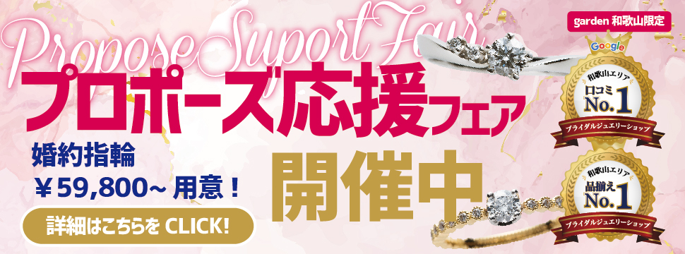 プロポーズ相談も出来るプロポーズ応援フェア開催中!大切な方にプロポーズしたいとお考えの方必見!婚約指輪(プロポーズリング・エンゲージリング)を渡したいけどまだ準備をしていないという方もご安心ください!和歌山最大級のgarden和歌山では、沢山の婚約指輪のデザインやお客様に合ったプランでプロポーズをサポート致します!一生に一度の憧れのプロポーズをぜひ成功させましょう!