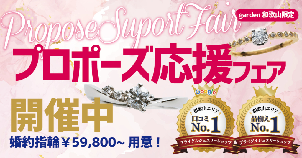 そんな思いを叶えるのがプロポーズ相談も出来るプロポーズ応援フェアです!大切な方にプロポーズしたいとお考えの方必見!婚約指輪(プロポーズリング・エンゲージリング)を渡したいけどまだ準備をしていないという方もご安心ください!和歌山最大級の品揃えのgarden和歌山では、沢山の婚約指輪のデザインやお客様に合ったプランでプロポーズをサポート致します!一生に一度の憧れのプロポーズをぜひ成功させましょう!